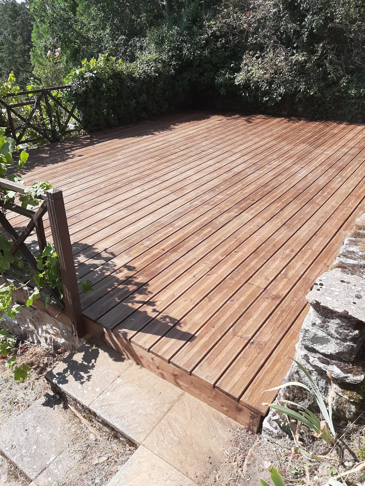 Voici la création d’une terrasse en bois, très bien exposée. Entourée de verdure et devant un magnifique paysage, notre client a pu profiter toute l’année du soleil et du beau temps !!!